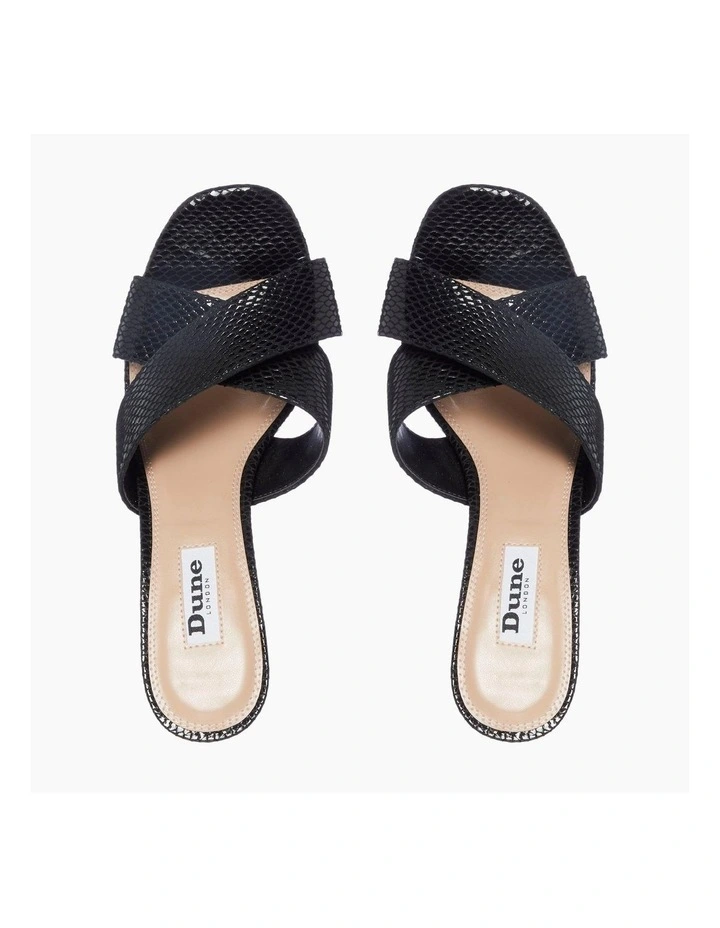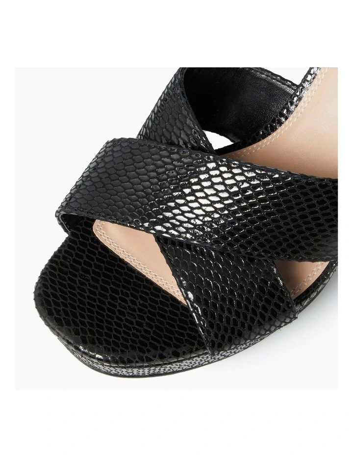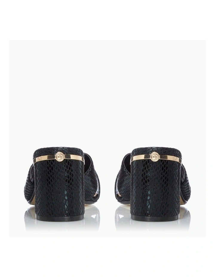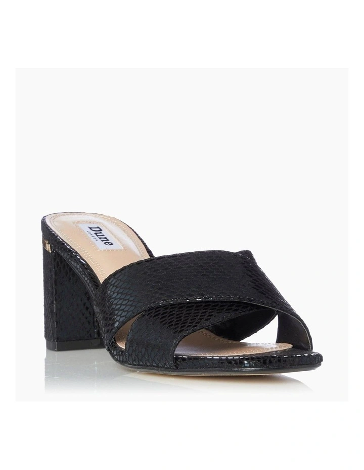 This sandal is the perfect choice for adding to your party line-up. In a classic slip on style it has hardware wrapped around the block heel. Finished with an open sandal toe and stylish cross over upper straps.