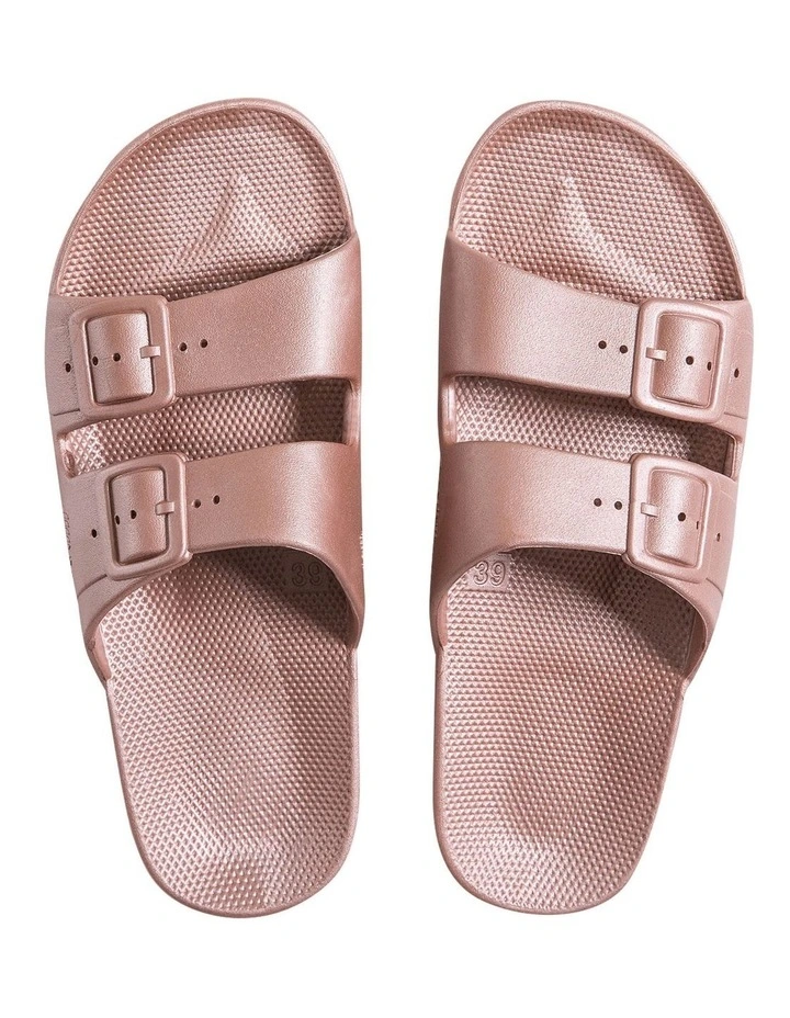 Freedom Moses are all about celebrating summer 365 days a year. Freedom Moses slides are vegan, cruelty-free and injected with air so you feel like youre walking on a cloud. All slides are lightly scented with milk and honey, helping you feel calm and carefree throughout the day.
