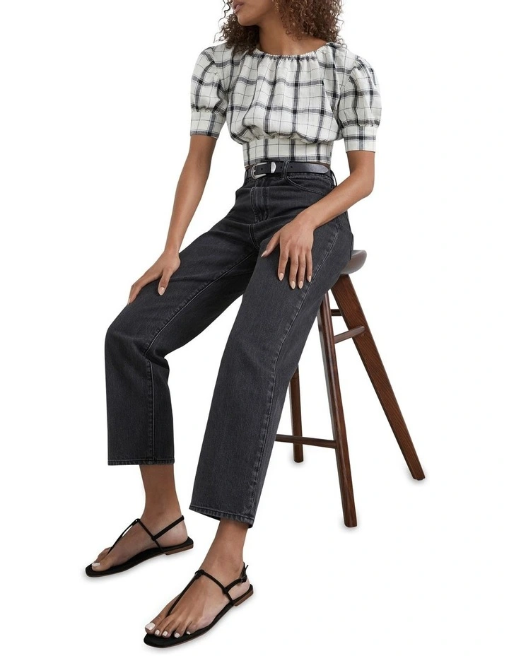 Sleek and stylish, the Ellie Leather Sandal features thin straps, a thong upper and a squared off toe. Pair with our Crop Linen Check Top and Girlfriend Fit Jean.