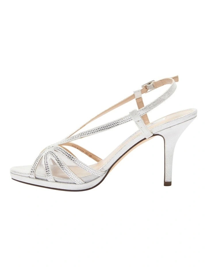 Crystal-encrusted straps and peek-a-boo mesh inserts add eye-catching glamour to this deco-inspired sandal with a throat line that lengthens the leg. BARBARA features a slim platform and is fastened with an adjustable back strap with a buckle closure.