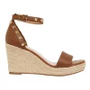 SHADOW is an edgy reimagining on a classic summer staple. The open toe style features a front leather strap and complimenting heel panel, punctuated with gold-tone studs and fastened with an adjustable strap, then rest on a braided high wedge heel. Style them with a printed mini dress and rustic bag to complete a vacation ensemble.