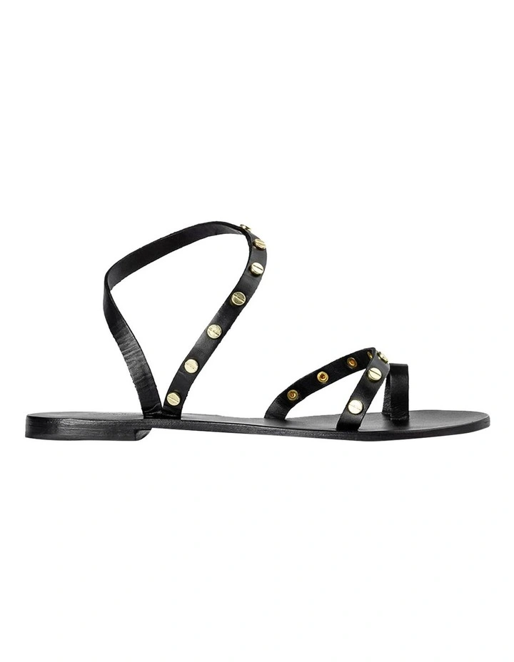 A black leather sandal with a toe ring, strap across the strap and ankle halter with gold-toned hardware.